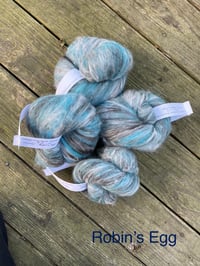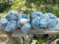 The Robin's Egg Bunowools are hand-cranked batts, around 3.1 - 3.3 oz, made with 33% New Zealand romney sheep wool (washed, carded, dyed in the U.S.), NY-raised and milled blended wool (Jacob, Polworth, and hybrid), and a blend of English angora rabbit fiber from our upstate New York homestead. Rabbits in service are listed on each bunowool.