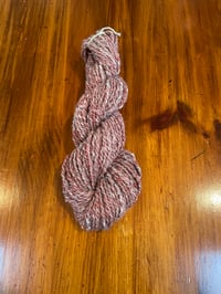 This skein is approximately 128 yards, 3.3 ounces of worsted weight English angora floof combined with sturdy dyed romney wool that has been blended with soft hybrid sheep's wool. The result is a tweedy yarn that's robust yet soft, and which will develop a halo in time. It's a light gray-orange, with tweedy pops of gray-blue-white angora fiber.