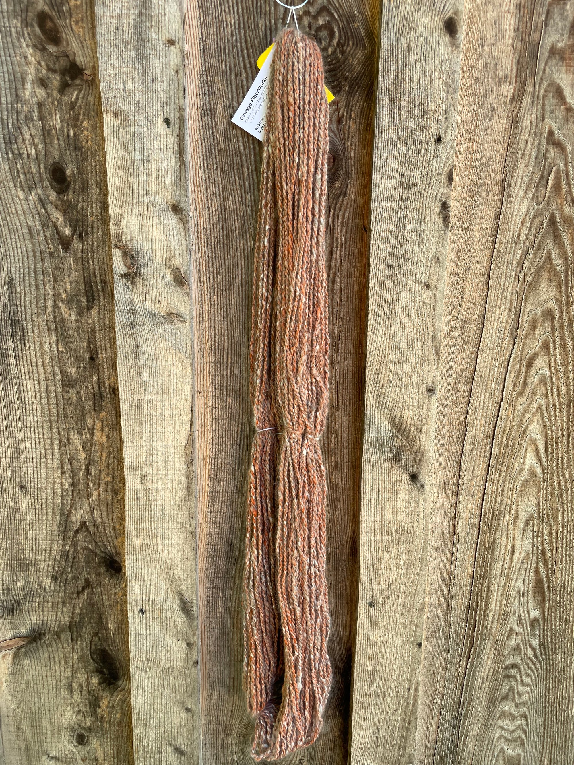 This skein is approximately 128 yards, 3.3 ounces of worsted weight English angora floof combined with sturdy dyed romney wool that has been blended with soft hybrid sheep's wool. The result is a tweedy yarn that's robust yet soft, and which will develop a halo in time. It's a light gray-orange, with tweedy pops of gray-blue-white angora fiber.