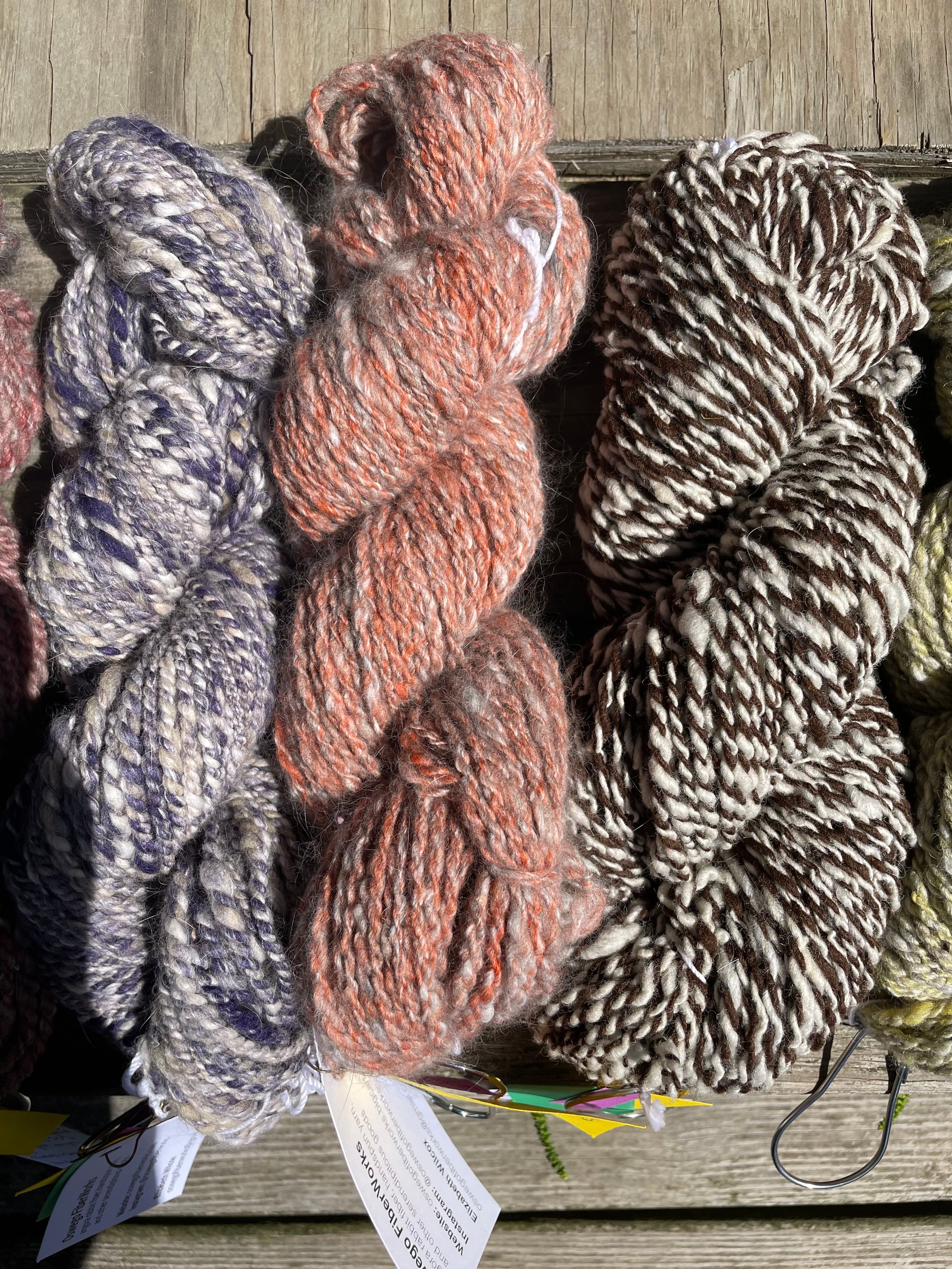 This yarn was spun from an Orange Posset Bunowool, which may be available in a separate listing for handspinners who wish to achieve their own weight of yarn. The yarn is 1/3 New Zealand romney wool that has been processed and dyed in the U.S., 1/3 New England blended sheep's wool, and 1/3 NY English angora rabbit fiber from our homestead in upstate NY. The rabbits in service for this yarn were Penny, Elaine, and Frederick.