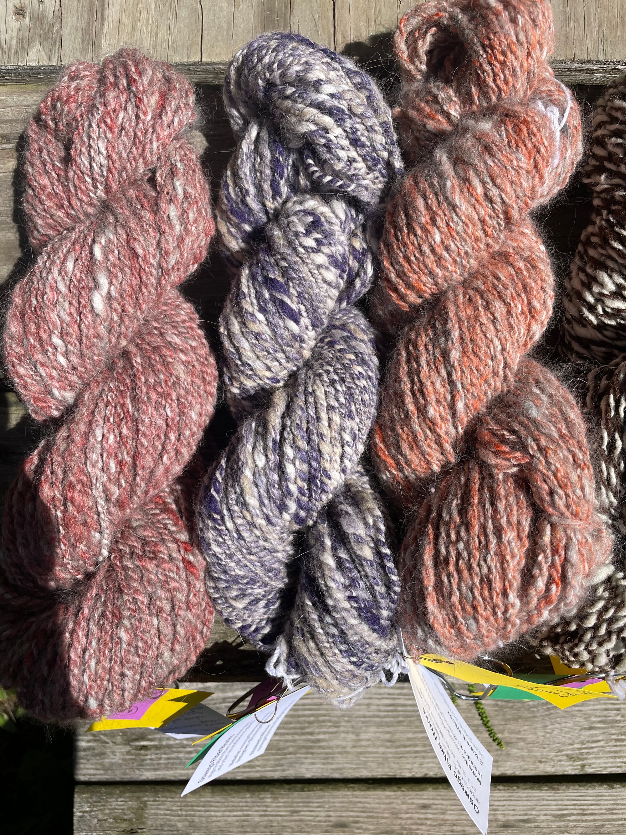 Fiber content: 1/3 commercially-sourced merino wool, 1/3 romeldale CVM wool from Lochan Mor Farm (https://www.lochanmorfarm.org/) in Cato, NY, and 1/3 English angora rabbit fiber from our own homestead in upstate NY. The rabbits in service for this yarn were Penny, Theo, and Afina.